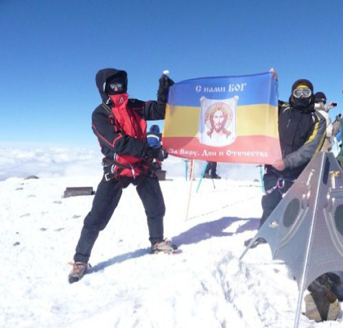 На восточной вершине самой высокой горы Олег Шатаев и Андрей Трикозов водрузили флаг с образом Спаса Нерукотворного, надписями "С нами Бог" и "За Веру, Дон и Отечество".
