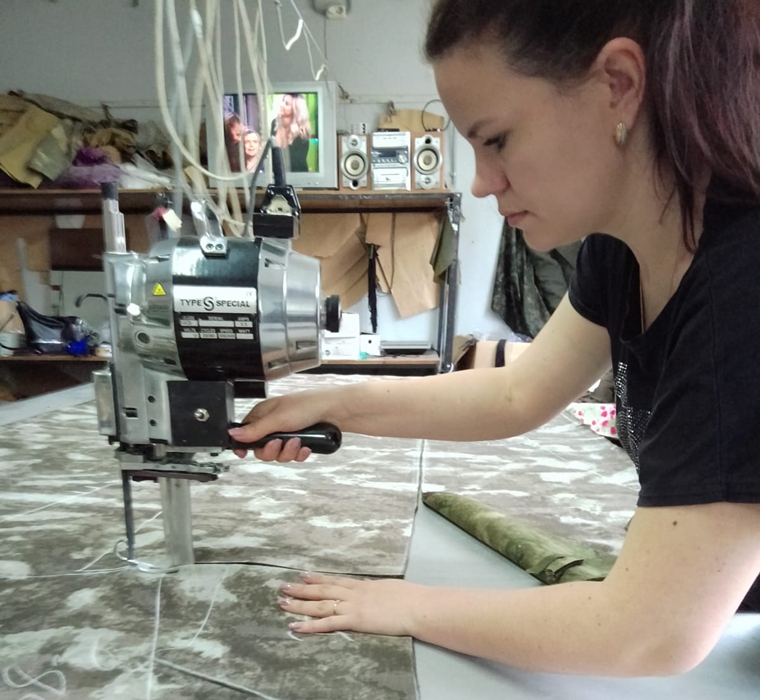 НА ФОТО: закройщик Анна Калинина мастерски выполняет свою работу, а также тщательно собирает подходящие для изготовления масксетей обрезки тканей, чтобы передать их волонтёрам