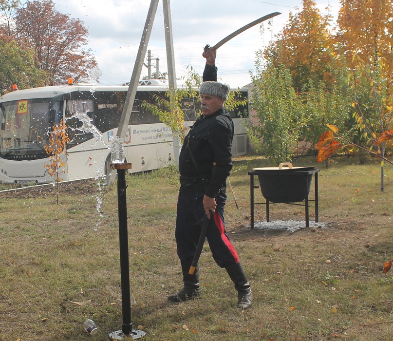 После торжественной части все переместились на пространство праздничной ярмарки. Там угощали традиционными блюдами казачьей кухни, можно было оценить мастерское искусство владения шашкой и нагайкой, посмотреть выставку настоящего старинного казачьего оружия.